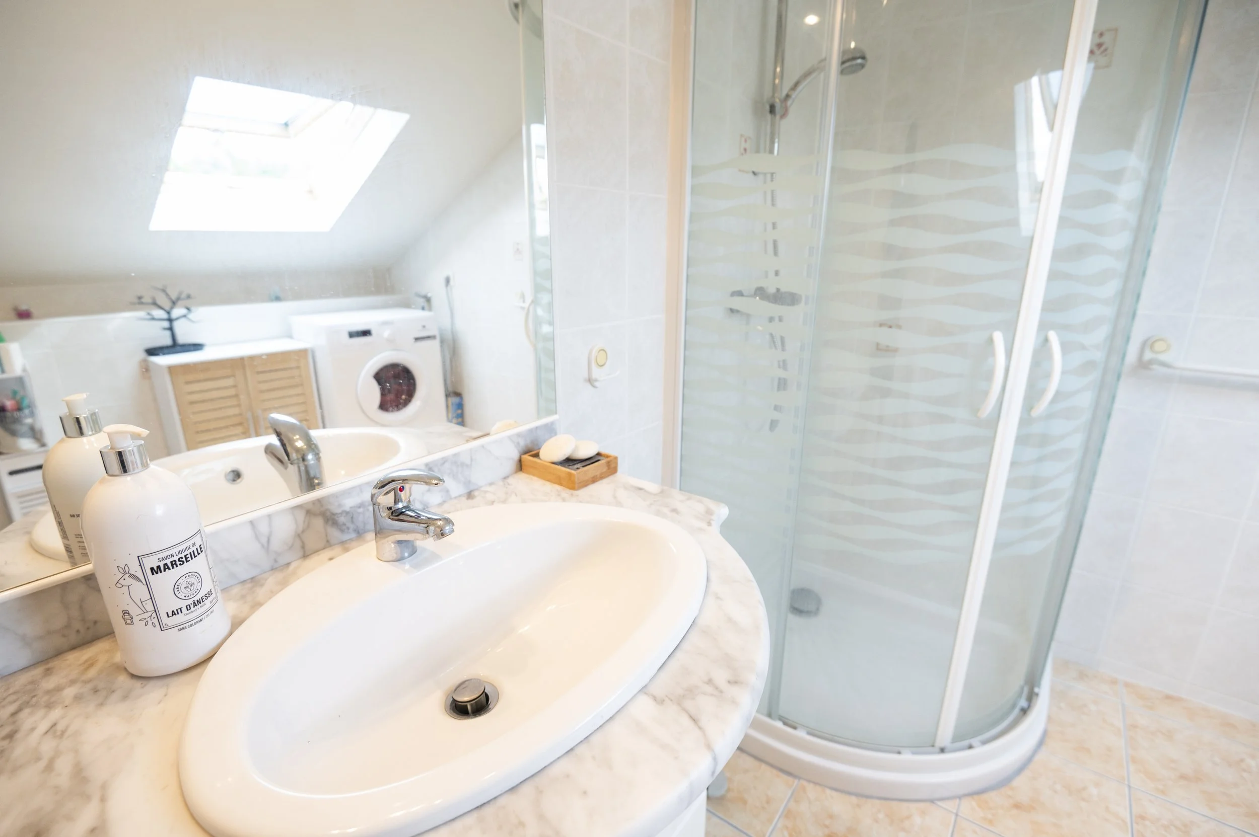 Une Salle de bain neuve avec lavabo, cabine de douche et WC